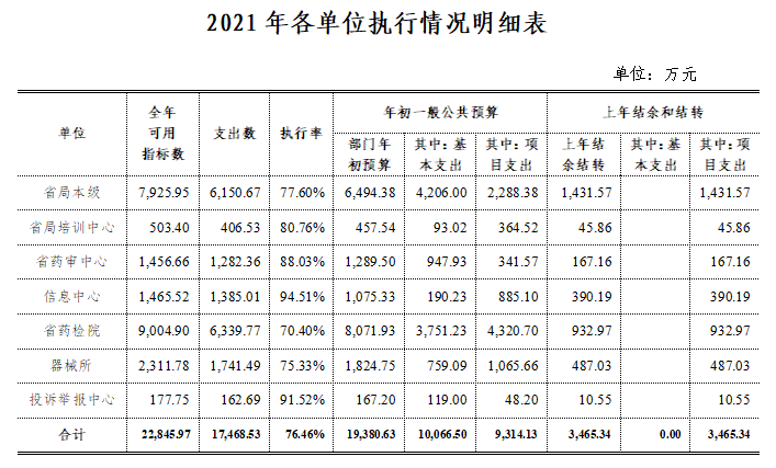 918博天堂2021年一般公共预算全年可用指标22,845.97万元,其中:年初预算指标19,380.63万元,上年结余指标3,465.34万元,全年支出17,468.53万元,执行率为76.46%,各单位执行明细如下: